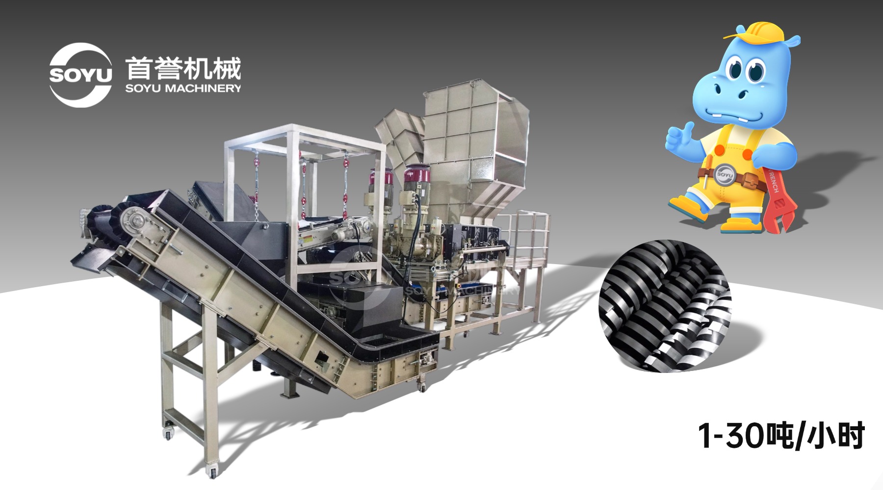 在行业优势方面,首誉四轴撕碎机(FS系列)极具竞争力。凭借源自意大利的成熟技术和欧盟CE认证,关键电气件选用西门子、施耐德等国际品牌,安全与质量完全接轨国际标准,合规可靠,让用户使用起来没有后顾之忧。而且它采用双级差速剪切的工作方式,上下四轴呈差速运转,先粗碎后精碎,通过撕扯、挤压、剪切的复合作用,对大件、框状、韧性或粘性物料的处理效率大幅提升,不易出现缠轴堵料的情况,大大提高了整体生产效率。此外,该设备重载耐用,主刀采用DC53/D2高合金耐磨钢,辅刀为模锻件,可多面翻磨;主轴经过硬化处理,加厚刀箱焊接后退火,抗高扭矩与冲击能力强,有效降低了设备的损坏率,延长了设备使用寿命。智能安全也是其一大亮点,PLC + 触摸屏控制,支持自动启停、反转、过载保护;行星减速机驱动,低转速大转矩,同产能下能耗更低,粉尘与噪音更易达标,符合环保要求的同时,降低了运营成本。